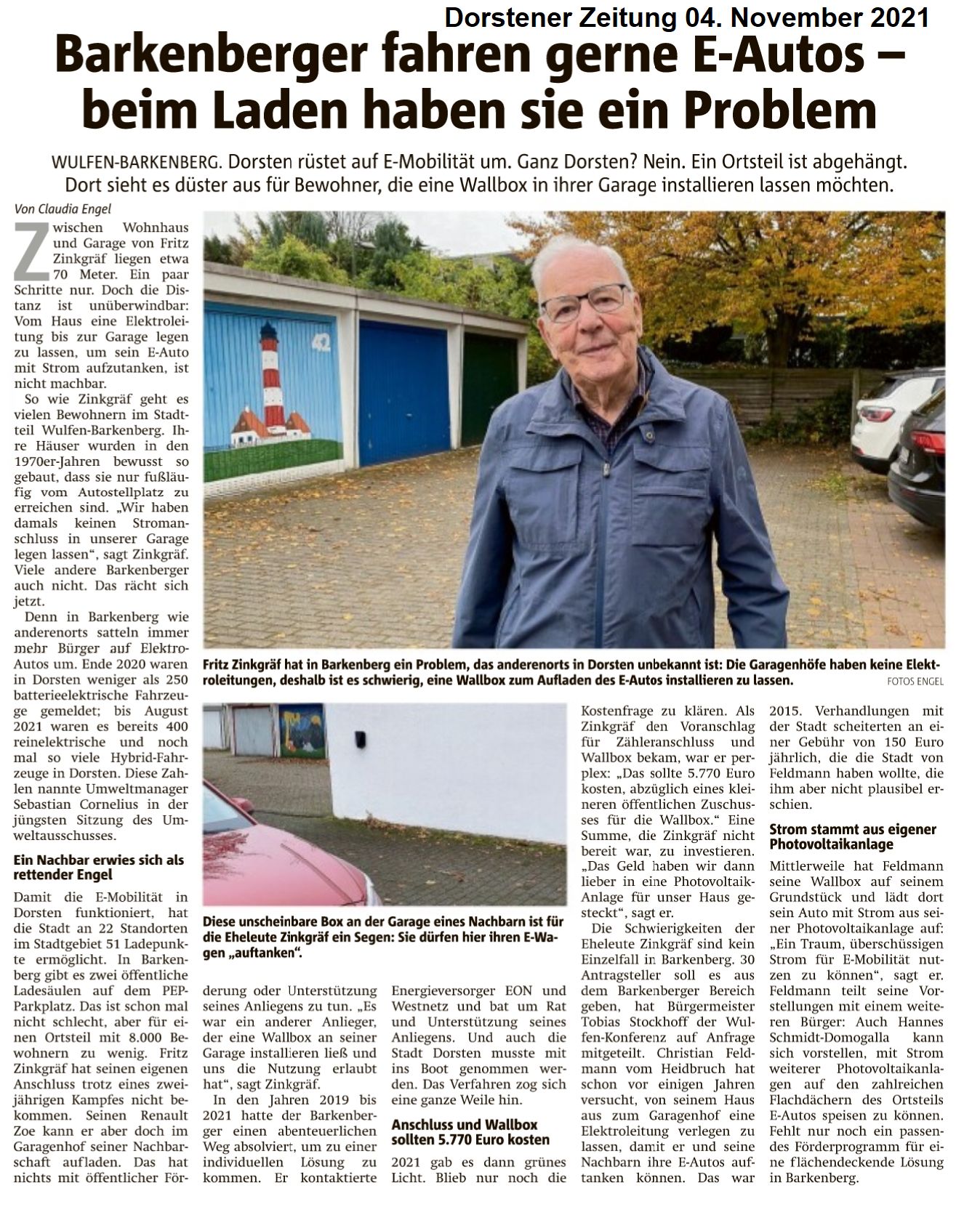 | 04.11.2021 | Dorstener Zeitung: | Barkenberger fahren gerne E-Autos - beim Laden haben sie ein Problem | Lesen |